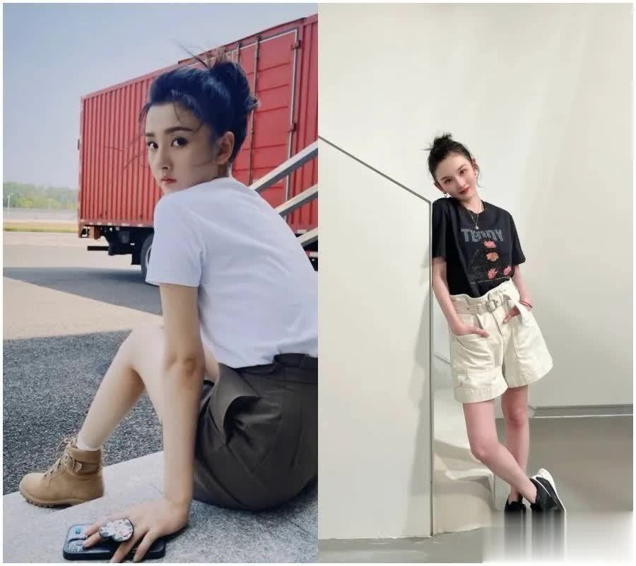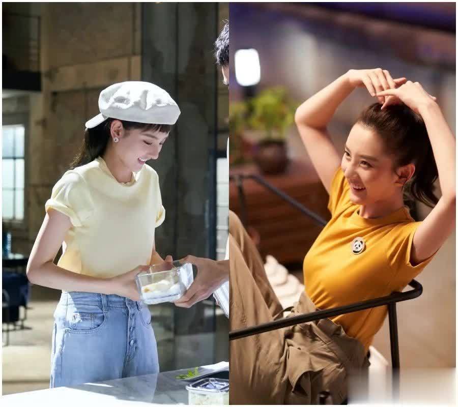再来说说短袖,纯素色的短袖在她身上的确出现过不少,不过我更推荐这种有颜色的。比如下面的这两身黄色就是夏日模板了。尤其是左边的这一身,她甚至还把袖子卷起来,小心机满满的。