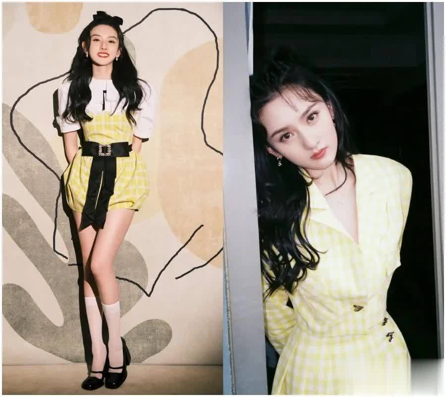 发现她还挺喜欢穿黄色裙子的,下面这两身都很美,分别是半裙和套装,像右边这种款式这两年还挺受欢迎的,尤其是很多参加活动的女孩儿也可以这么穿。像她这样加上一个蝴蝶结,或采用露一厘米宽度的方法也是不错的。